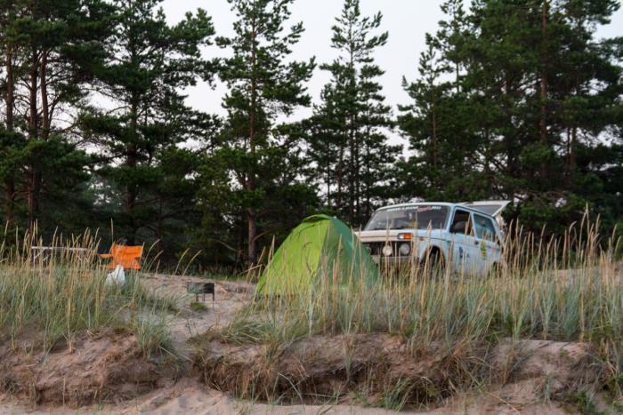 Невероятный песчаный пляж, и бесконечная гладь Балтики, еще полчаса назад, я думал, что Еву всё-таки придется выкапывать и якорить, песок обволакивал зыбкими сетями. Машина ехала всё тяжелее и тяжелее, но вырвалась из плена, и, натужно гудя вентиляторами, еле справляющимися с нагрузкой жара, подняла нас на бархан «Одинокая сосна», где мы и заночуем.