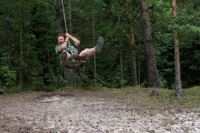 Мы свернули сюда случайно, просто ехали и понимали, тут за лесом в километре море, первая выбранная своротка оказалась глухой, вторая тоже, а третья уверенной стрелой побежала в нужном направлении, всё это привело нас к полноценному детскому палаточному городу, с полной инфраструктурой и даже веревочным парком, вы же знаете, как мы любим тусовки, людные места и общение с незнакомыми людьми, поэтому руль сам собой повернул нас на 90 градусов влево, и мы помчались по прибрежному пляжу и мчались до тех пор, пока Ева не стала окончательно зарываться в мелком, сухом и очень глубоком песке. В самый раз, — сказали две евражки — все далеко.