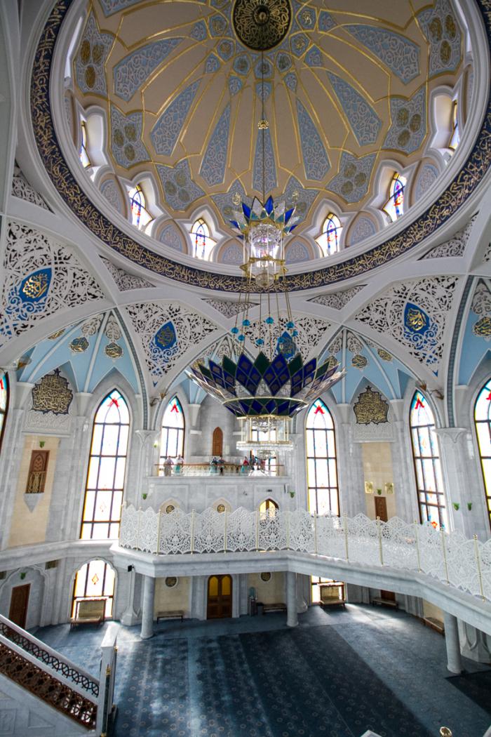 Обычные для мечети вырвиглазные ковры, здесь соблюдены в однотонной лазурной гамме, витражи наполняют здание светом и радостью. Казань – жемчужина Поволжья, а её мечеть – жемчужина Казани.