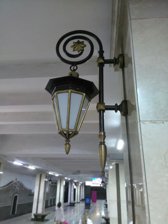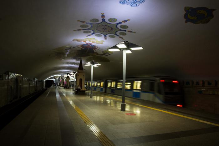 Главное отличие от Московского метрополитена – пещерность. Здесь холодно, пахнет сыростью и темновато, но красиво. Восточные розетки обрамляют сидящего по центру потолка дракона Зиланта, а стены украшены иллюстрациями восточных сказок.