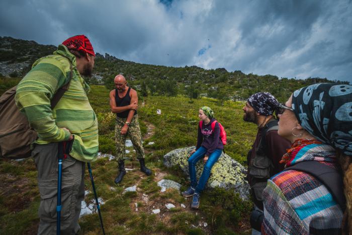 Суровая и скомканная встреча в итоге обернулась приятнейшим знакомством и взаимными веселыми баснями. Но пока мы робко, гуськом, под интересный рассказ поднимаемся по маршруту.