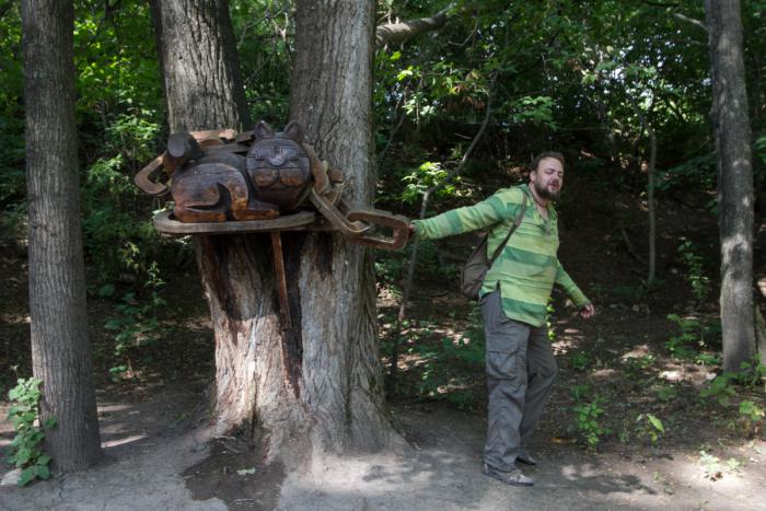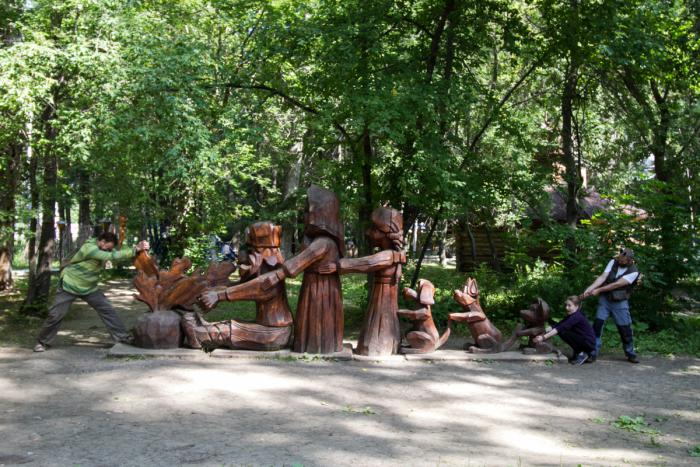 Купили билеты и стали коротать время до экскурсии в парке. В парке всё, так или иначе, связано с легендой этих мест – Ермаком Тимофеевичем. Поэтому даже рядом со скульптурой репки и прочих персонажей одноименной сказки нам мерещилась репка Ермака, Бабка Ермака, Внучка и Жучка тоже Ермака.