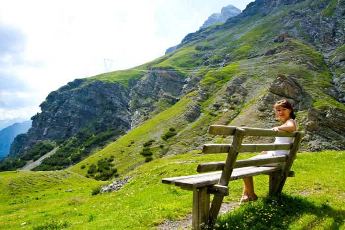 Вот они натуральные альпийские луга, цветы и деревья. Коровы в полной безмятежности щиплют вкусную травку. Запах прекрасный, воздух чистейший. Облака плывут быстро. Когда выходит солнце, становится жарко, а когда тучка его накрывает — прохладно. Там прекрасно просто ходить, просто гулять, просто сидеть на лавочке, которые заботливо установлены на горных площадках.