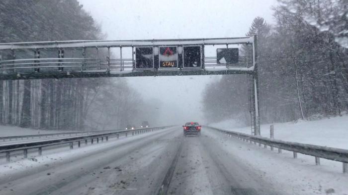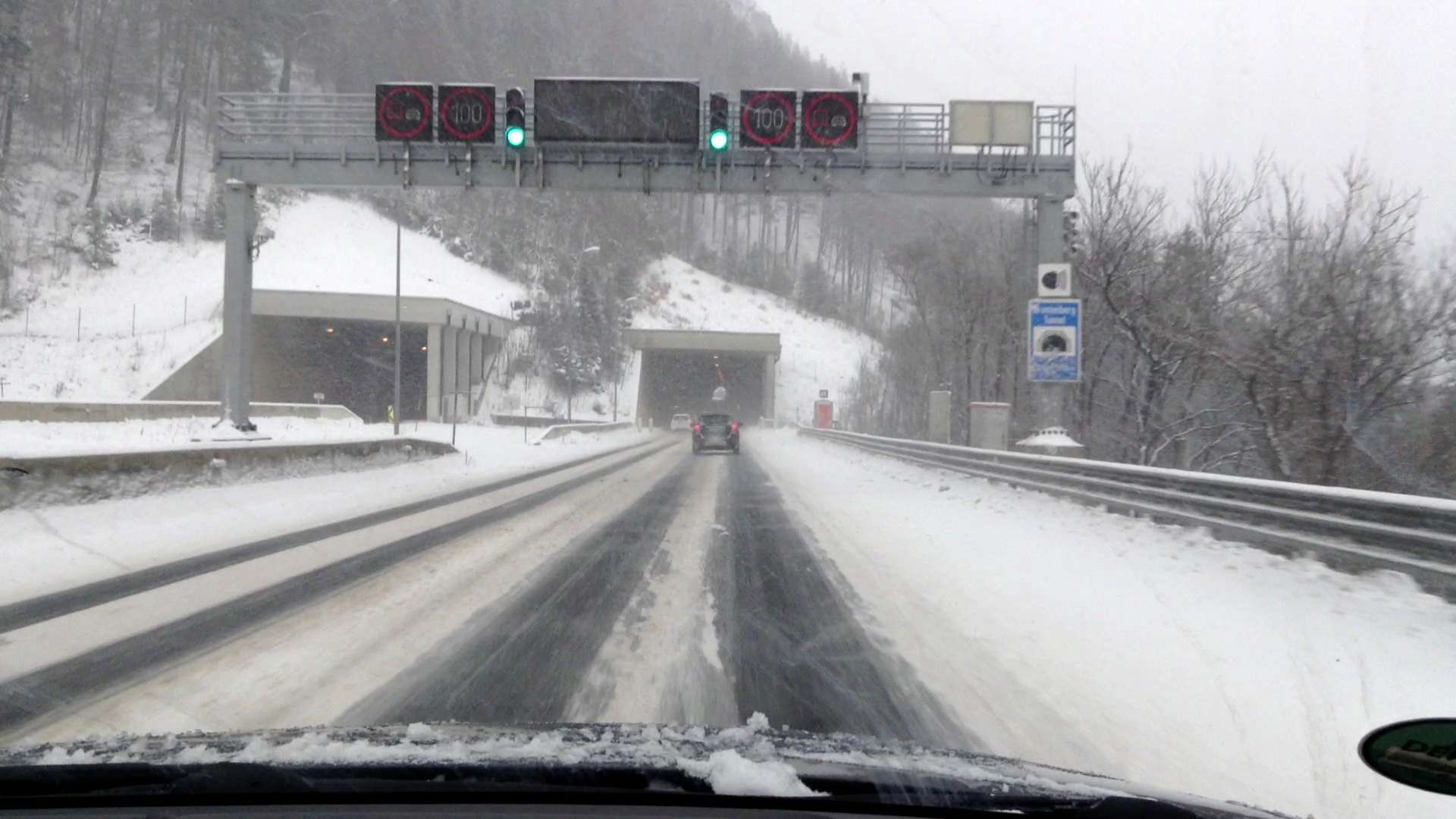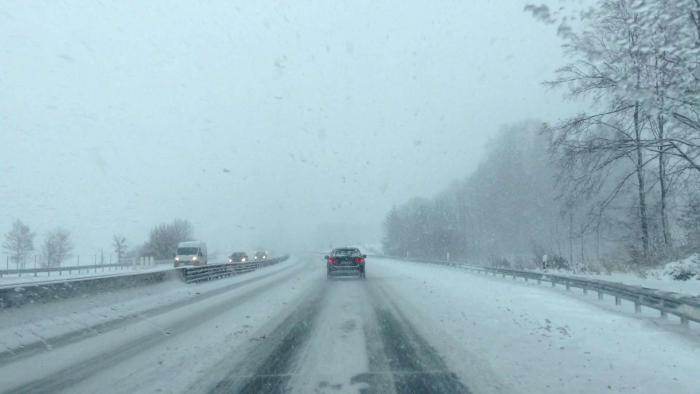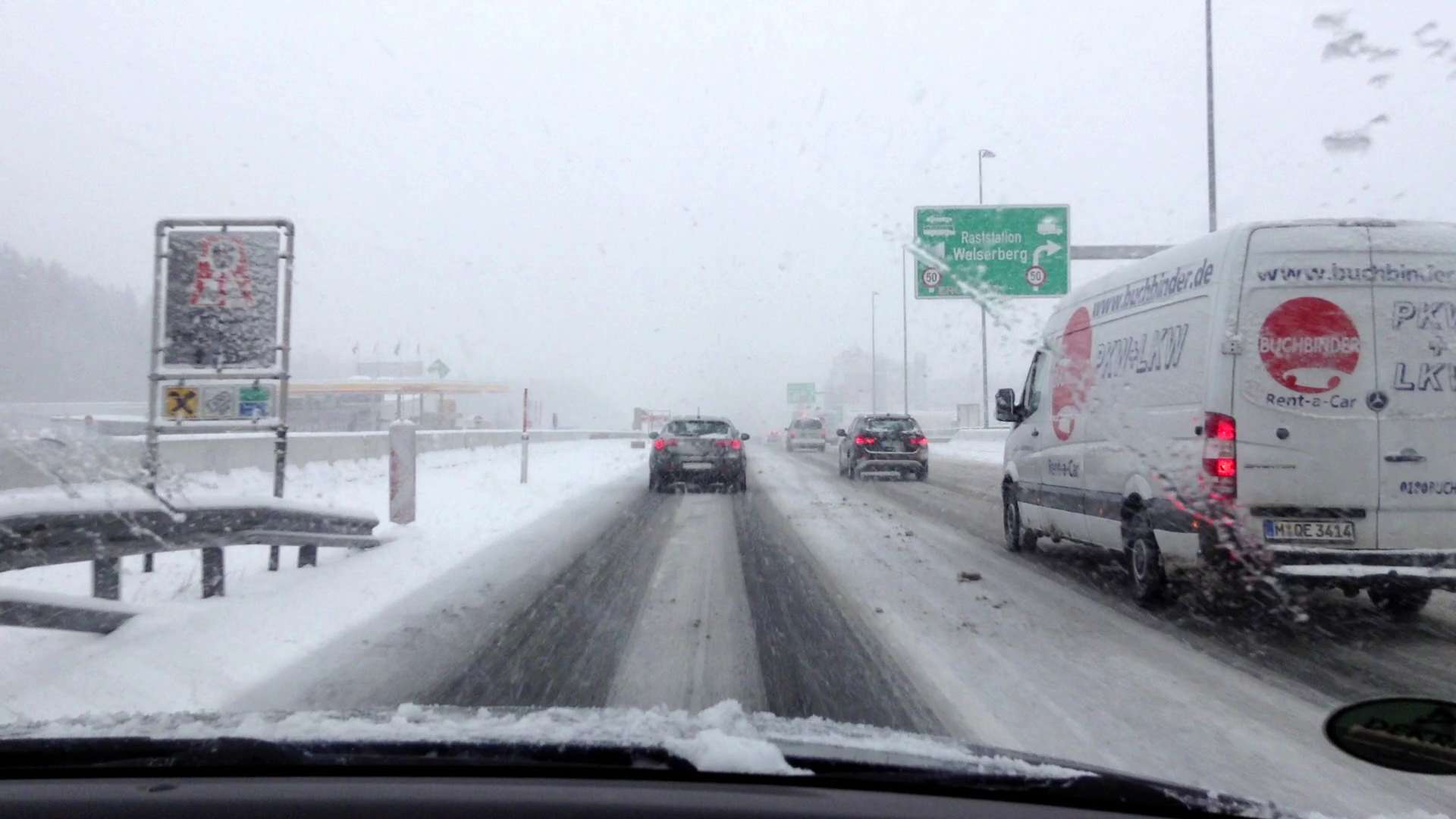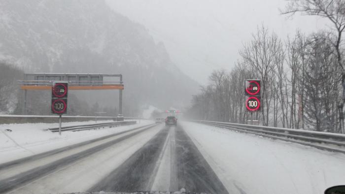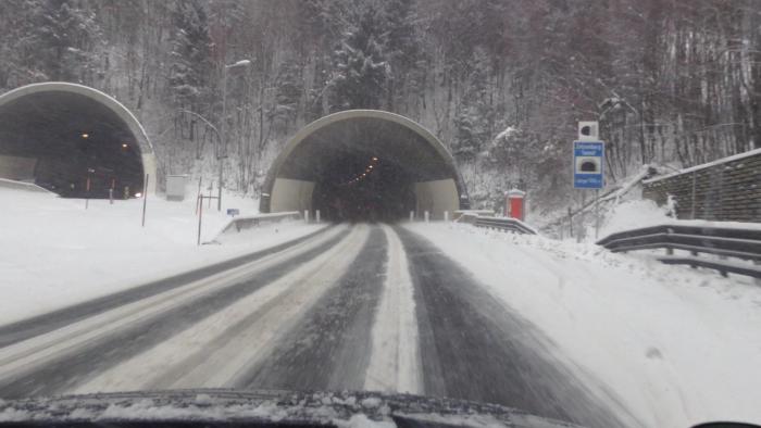 За ночь выпало много снега. В городе дорожные службы справлялись хуже чем на трассах… Многие городские дороги были заметены снегом, иногда под снегом чувствовался лёд. Кроме этого снегопад продолжался. И когда мы выехали из города – снегопад усилился… Радовало одно, что ехать было всего около 180 км. На заправке была куплена виньетка – 9 Евро (на 10 дней).