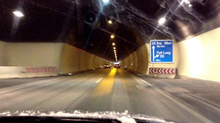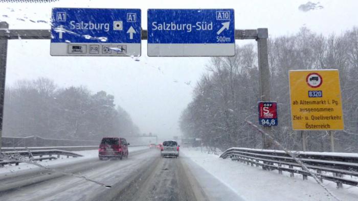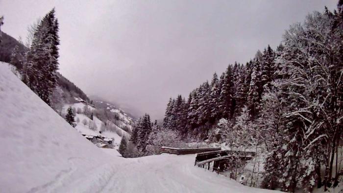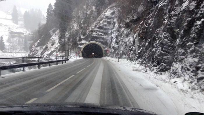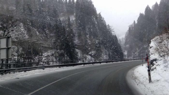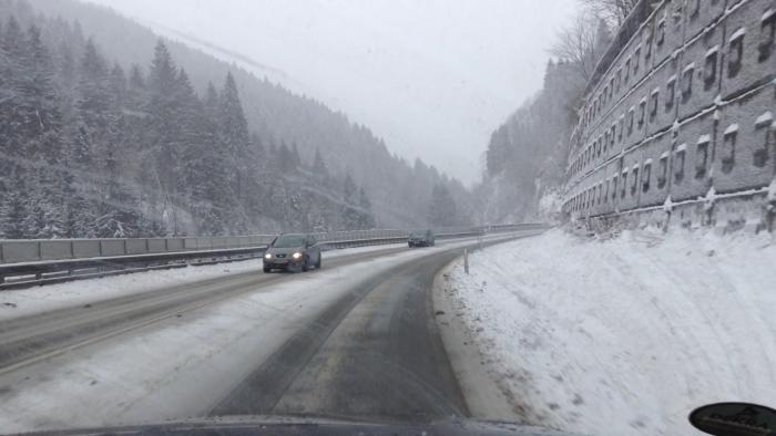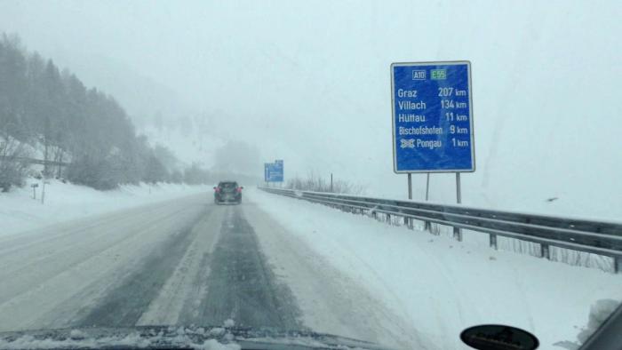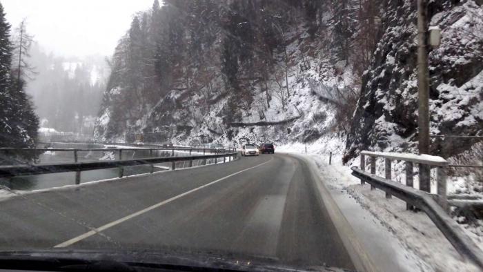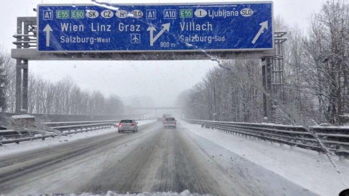 Из-за сильного снегопада и метели я поехал более длинной, но менее опасной дорогой — по трассе Е60 (через Зальцбург), поэтому получилось около 230 км (сначала свернул на короткую дорогу, как повел навигатор, но быстро сориентировался, что дорога узкая, второстепенная, заснеженная и может быть даже перекрыта полицией в горах (или открыта только для машин с цепями на колесах), кроме того смущал достаточно плотный встречный поток машин…), поэтому развернулся и покатил в сторону Зальцбурга. Дорога очень красивая, идет вдоль горной речки, достаточно широкая. Надо сказать, что австрийцы молодцы, и быстро и качественно убирали снег с крупных дорог.