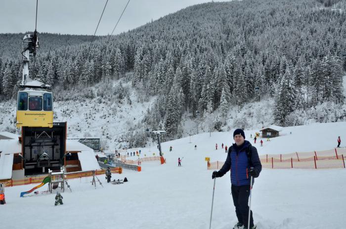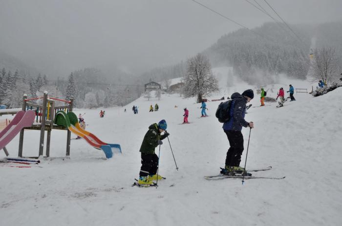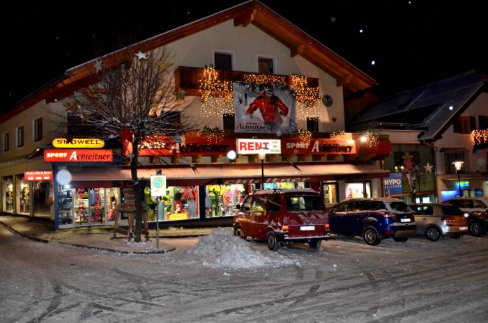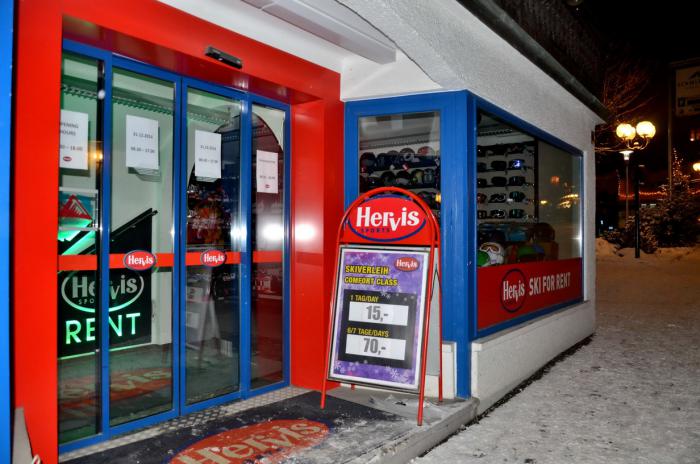 — днем катались на лыжах… Арендовали лыжный инвентарь в HERVIS, расположенный около автобусной станции и нижнего фуникулера в центре городка.