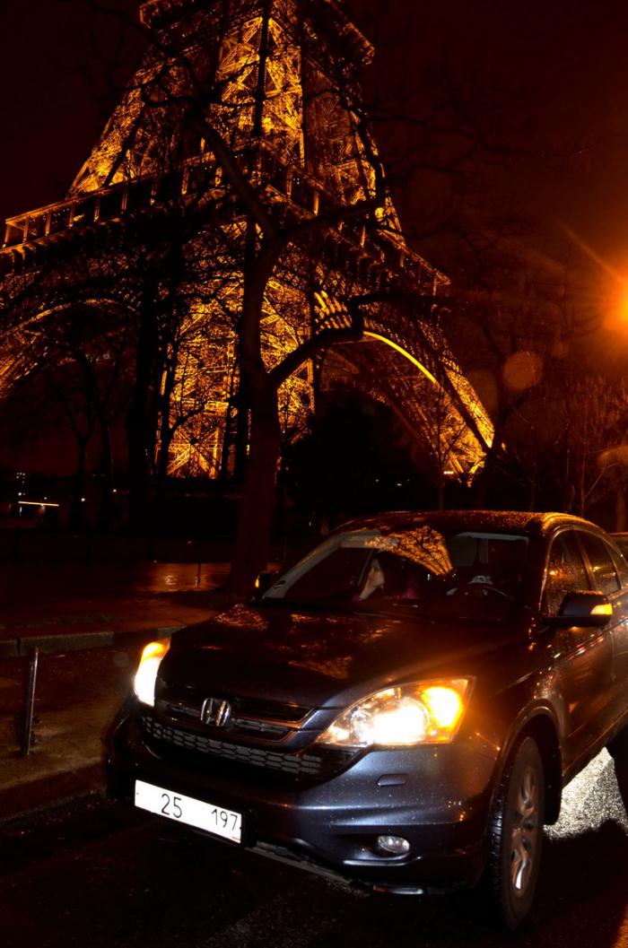 Вечером мы поехали кататься по Парижу на собственном авто, в первую очередь для того чтоб полюбоваться на сверкающую Эйфелеву башню и посетить Монмартр…. Навигатор нас вывел прям к подножию Башни, где мы припарковались с включенной аварийкой (как и многие другие автомобилисты) в ожидании светопреставления….