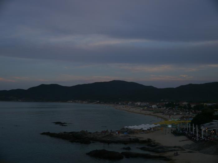 Пляж Сарти. Формально лежачки с грибочками бесплатные, нужно лишь заказать в ближайшей кафешке воду, кофе или пиво. Бутылочка пива стоила там два евро, т.е. сто рублей и лежак ваш на весь день.