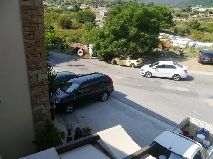 Про отель. Он реально порадовал! Находится на окраине посёлка, поэтому не слышно шума и гама центральных улиц, но в то-же время до центра с его многочисленными магазинами и кафе — 150 метров, до пляжа — 250 метров. Стоянка для авто находилась почти под балконом.