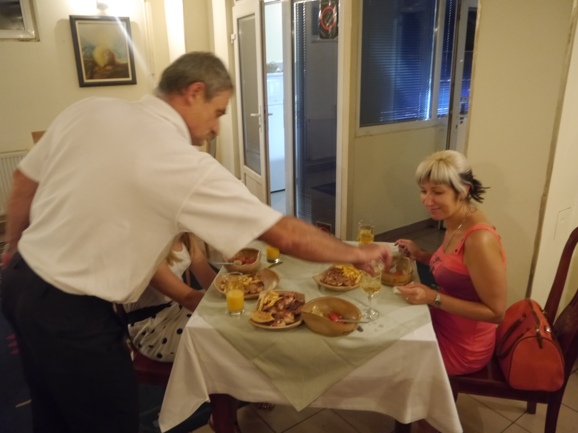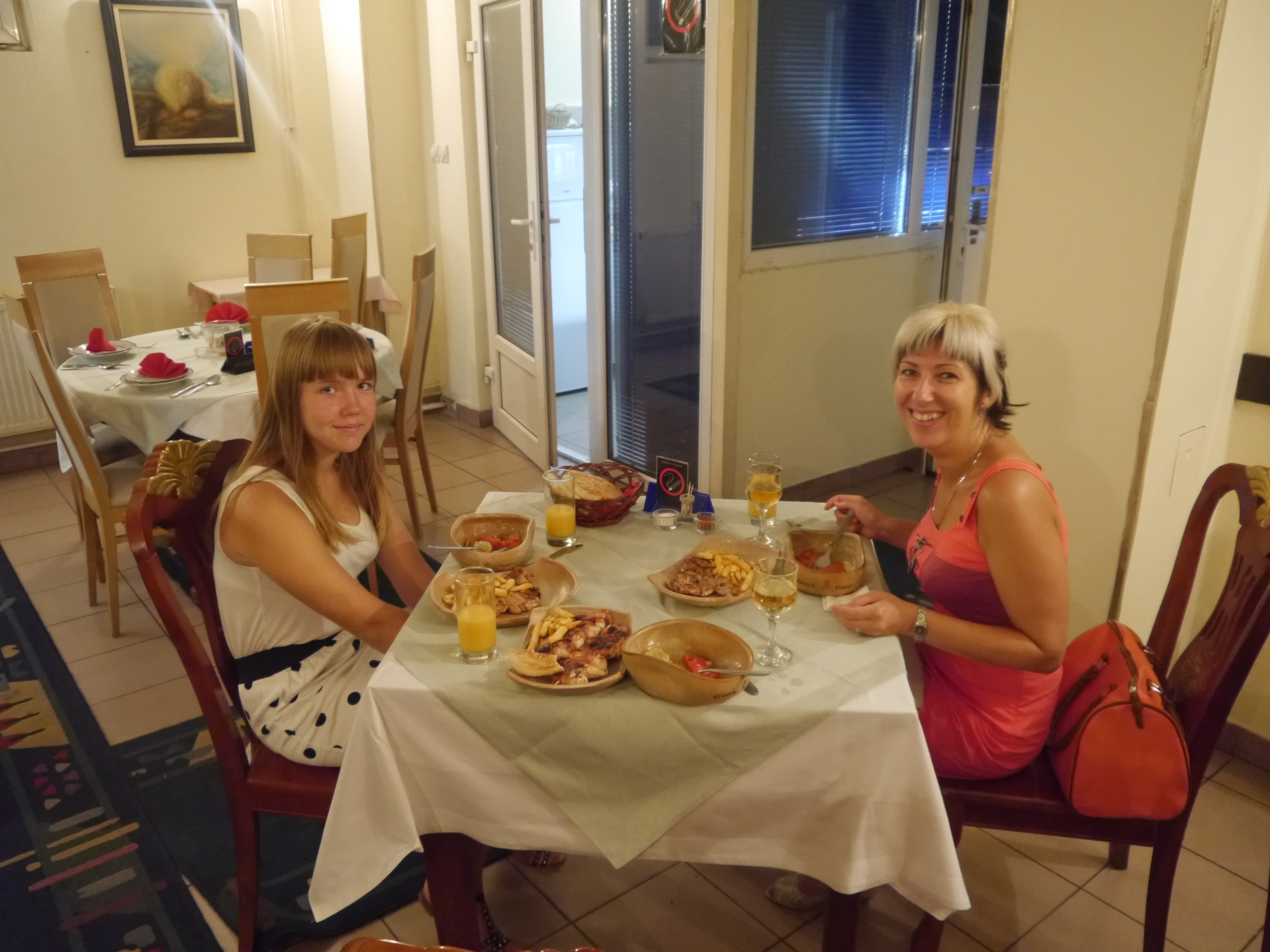 Вечером, выбившись из графика, мы прибыли в . Служащие отеля были вежливы, великолепно знали английский (в отличие от нас, иногда мы просили их перейти на более удобный сербский). Они быстро нашли место на стоянке и заселили в номер. Так как приехали поздно, решили осмотр достопримечательностей оставить на утро, а сегодня сходить поужинать в ресторанчик, поиски которого оказались непростым делом. Из номера вышли уже затемно и двинулись по улице. Прошли метров 500 — ни одного ресторана, только фаст-фуд. Решили спросить у женщин, которые торговали овощами, на смеси русского и английского. Одна из них говорит другой: «Как сказать по английски „через двести метров и направо?“. Но мы всё прекрасно поняли и уверили, что на английский переводить не надо.