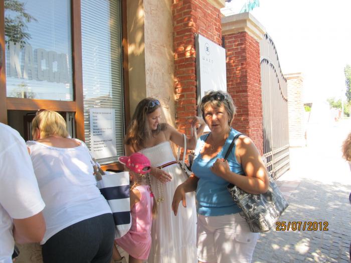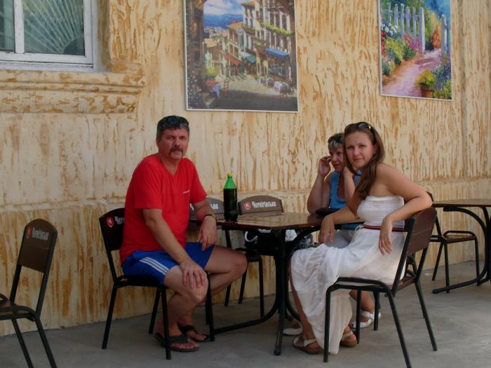 Наши переживания были напрасны, хозяин виллы «Диана» Александр Балобанов даже не стал пытаться получить лишние 100 долларов за просроченный день. Внесенная нами по прибытию доплата в 900 долларов (7 200 гривен) обеспечила наше пребывание в «Диане» с 24 июля по 3 августа. Хочу сразу отметить, что все заявленное о вилле «Диана» на сайте http://www.zatoka.com соответствует действительности. Здание виллы расположено в первой береговой линии, ступив с крыльца «Дианы» вы сразу попадаете на пляж, море у Ваших ног. Стоимость двухместного номера 400 гривен в сутки это не дешево, питание не входит в стоимость проживания, но все что обещано действительно есть. Мебель новая, холодильник, кондиционер, большой жидкокристаллический телевизор, Wi-Fi. Приятно было осознавать, что тебя не обманули, что из крана бежит и холодная и горячая вода, что телевизор не просто висит на стене, а еще и хорошо показывает кучу программ, что кондиционер действительно охлаждает, а все электроприборы работают. Парковка для машин расположена под зданием, ее вместимость максимум семь машин которые встают достаточно плотно. Если кто-то из второго ряда захочет выехать, то необходимо согласовывать данное мероприятие с отдыхающими из первого ряда. Не очень удобно, но при мне места хватало на всех отдыхающих, и вопрос с въездом-выездом решался без эксцессов.