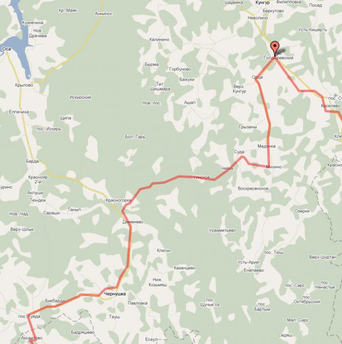 Перед Куедой есть участок (4.5 км) грунтовки, но вполне приличный по которому можно двигаться со скоростью 70-80 км/ч. От Куеды до Чернушки есть небольшой участок недоделанной дороги, но над ним сейчас работают дорожники, наверняка в этом году управятся.