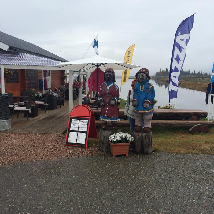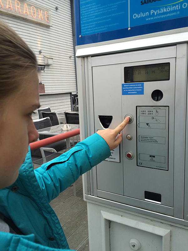 Путь лежал в Швецию. В принципе нам там особо ничего не надо, но 130 км до Швеции просто манили и наверное ещё их Икеа. Трасса волшебная, максимальная 120, но смотрю финны и больше идут. Водители выше всяких похвал, уступят, притормозят, подождут. Не потому что ты с русскими номерами, культура вождения у них такая. Швеция как Швеция, далеко не забирались, побродили по ИКЕА, пообедали в ресторанчике. Счет очень скромный, оплачивала картой, т.к. у них Шведские кроны, вышло 750 руб. Кстати, в Рованиеми есть отличный аквапарк, но дочка не захотела и мы поехали в Оулу, попрощавшись со Швецией. заранее забронировали опять же отель,60 евро ночь со скромными условиями, но ночевать можно и на паркинге бесплатно. Как я переливала на территории отеля в 6 утра бензин и не удержала канистру(откуда я знала, что она такая тяжёлая! на заправке мужчина заправил и в багажник поставил ), отдельная тема и отдельная бутылка водки за залитый бензином паркинг вспомнить стыдно, но бензин то был Российский! Местный по 1,8 евро, сильно не разгуляешься. Утренний осенний немноголюдный Оулу прекрасен. Рыночная площадь, с символом города толстым полицейским Пекка, набережная, старые торговые амбарчики.Потрогав Пекку за указательные пальцы, по поверьям финнов ты вне закона, все полицейские к тебе теперь благосклонны. Работает и на русских. ни одного штрафа не привезла.рядом с рынком платный паркинг.35 мин-1 евро. Кидаешь монетку-тебе талон.талон на торпеду под стекло и гуляй.На рынке витает, кружится, завораживает аромат различных вкусов. Тут и строганная оленина и семга всех видов приготовления, сыры, колбасы, мёд, фрукты, сладости. Берем строганины из оленя на 4 евро и кусочек филе семги в какой то штуке за 3 евро. Очень вкусно!!! Расположившись за столиком кафе на рынке и насладившись ароматным кофе вспоминаю, нужно купить открытку на рынке и марку (2.50 евро штука), опустив в рядом стоящий почтовый ящик вы получаете дома, или друзья открытку со штампом города Оулу символ толстого полицейского. Побродив по набережной, потолкались на площади у торговых палаток, посмотрели морошку свежую — 22 евро за кг)). Прошлись по улочкам около торговой площади, заходили в магазинчики и сувенирные лавки, жизнь здесь неспешная. Очень красиво и интересно. паркинг закончился и мы выдвинулись в Тиетомаа,долго блуждал мой навигатор, но привёл к восхитительному зданию научного центра. Паркинг нашла бесплатный недалёко и пешочком прогулялись до Тиетомаа. Паркинг в Финляндии это все! Смотрим знак, написано 2 часа.Выставляем парковочные часы(вы их обязаны купить, стоят 3-4 евро, на заправках. Но хотя, честно говоря, совсем недавно поменялись правила и можно просто на любом клочке бумаге написать время когда оставил машину и положить под лобовое стекло- мы выбрали первый вариант и часики остались на память ;) ) на настоящее время, мысленно отсчитываем во сколько должны явиться, кладём часы на торпеду под стекло и с чистой совестью два часа гуляем. Через 2 часа, если вам ещё нужен паркинг, вернитесь переставить часы. Минимальный штраф 40 евро и можете плакать, стонать и молить, но если нарушите вам его выпишут.А заплатить штраф вы можете только в банке! А если не заплатите, проблем с визой и границей не избежать. Тиетомаа в Оулу это научно образовательный центр. Нужно около 3-4 часов для того, чтобы побывать на всех экс
