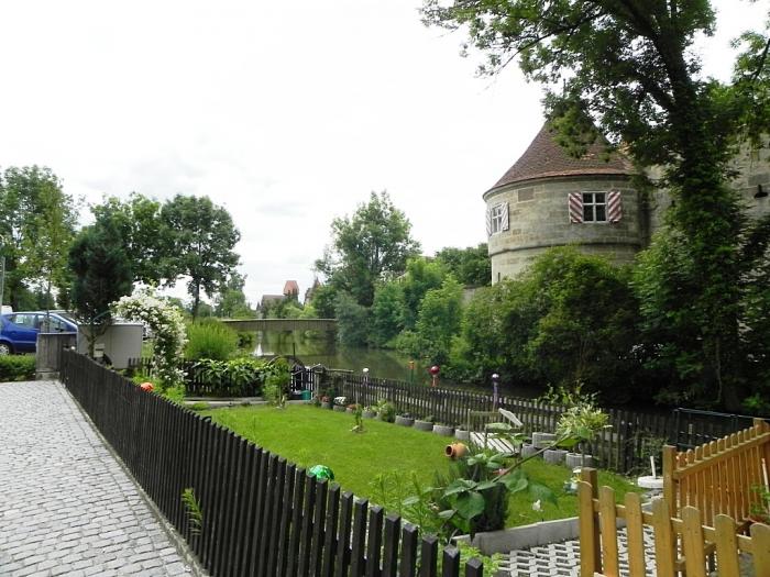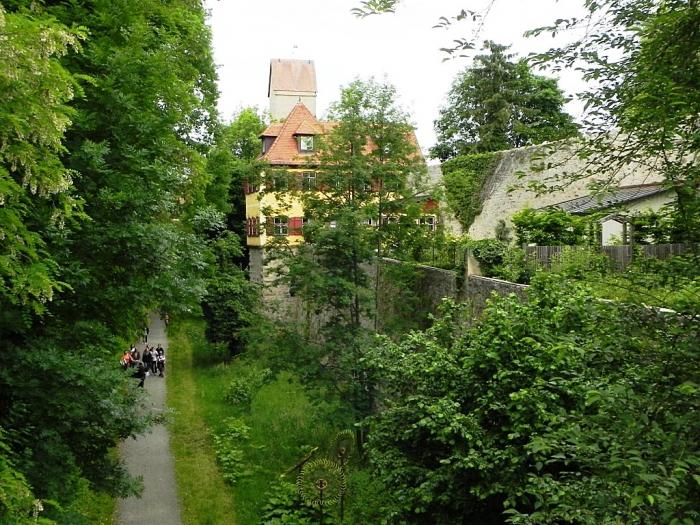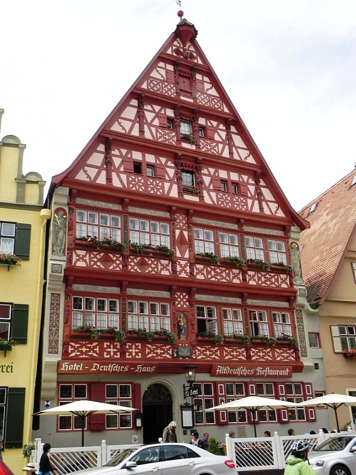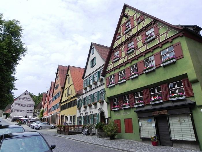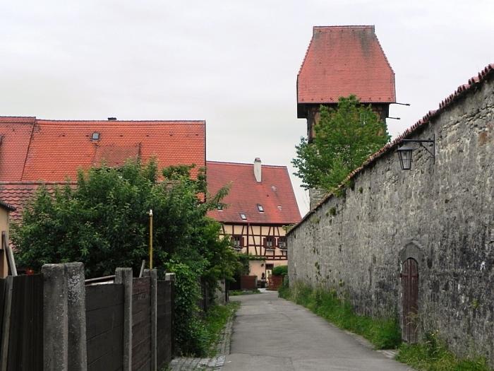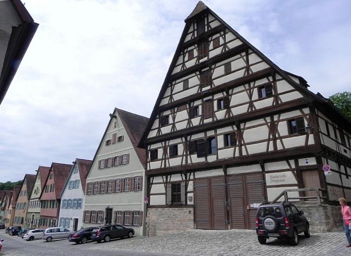 Тем не менее, преодолев себя, мы всё-таки ненадолго вернулись на городские улицы. В этой части Динкельсбюля находятся относительно редко встречающиеся во Франконии фахверковые «небоскрёбы». Как правило, подобные сооружения использовались в качестве зернохранилищ. А сейчас в них частенько располагаются молодёжные хостелы.