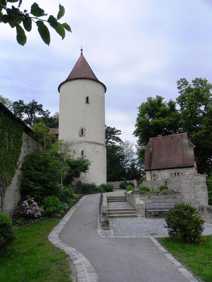 Но мы решили пока не выходить за пределы исторического центра, поскольку нас настойчиво соблазняла самая красивая ненадвратная башня Динкельсбюля – Бёерлинзтурм. Среди прочих она резко выделяется нехарактерной конструкцией – фахверковым верхом и очень крутой двускатной крышей. Видимо, поэтому Бёерлинзтурм является одним из символов города. Занятно, что она носит имя башенного сторожа.