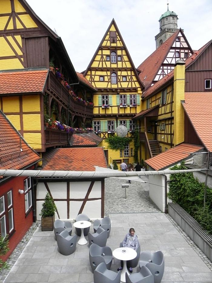 Дабы не смазать общее впечатление о Динкельсбюле, мы ещё некоторое время бесцельно побродили по его оживлённым улицам. А напоследок всё-таки решили отыскать Хецельхоф – типовой средневековый внутренний дворик в доме местного патриция. Нашли мы его совершенно случайно, поскольку для этого пришлось пройти через холл какого-то отеля. Как потом оказалось, пускают туда небесплатно. Но нам повезло – администратор с кем-то беседовала и на нас внимания не обратила.