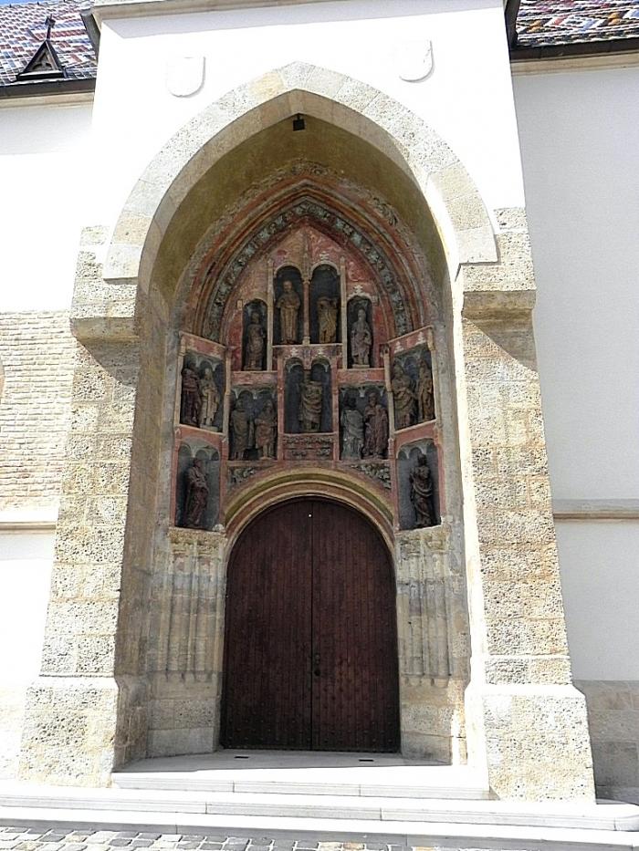 А вот главная художественная ценность храма – уникальный готический портал с размещёнными в нишах 15 фигурами библейских персонажей — относится уже к XIV веку.