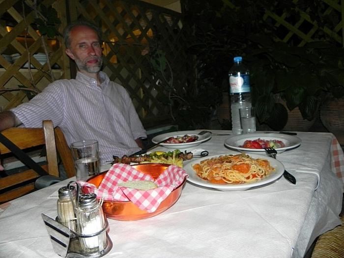 Обслуживал столики хозяин собственной персоной. Был необыкновенно учтив и галантен. Таверна пользуется популярностью у итальянцев, так как специализируется на итальянской кухне. Машу это вполне устроило, поэтому она заказала пасту. Ну, а я предпочёл мясо в виде шашлыка.