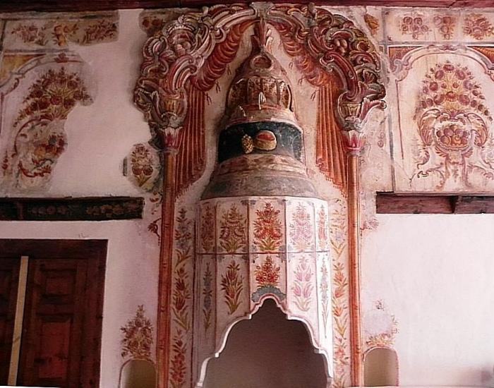 Здесь уже присутствует отделка стен фресками, деревянные розетки на потолке имеют инкрустации.