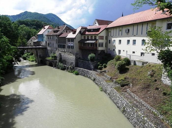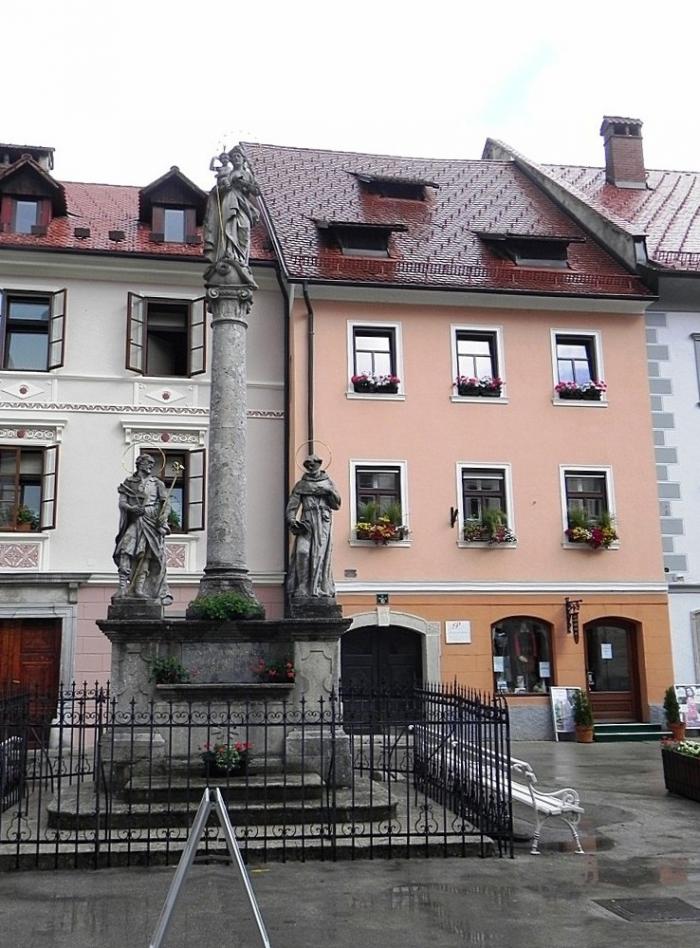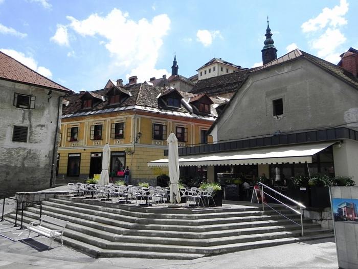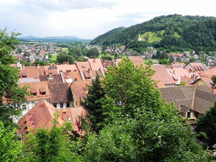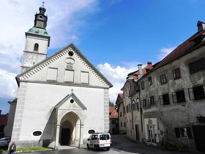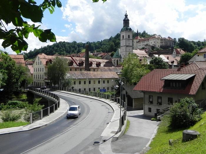 Поскольку в этот день покидать Словению мы не планировали, переезды от одной запланированной остановки к следующей были непродолжительными. Покинув Блед в два часа дня, мы меньше, чем через час прибыли в Шкофья-Локу (Škofja Loka). Машину пристроили на краю какой-то ведомственной стоянки, после чего практически наощупь пошли искать городской центр, руководствуясь лишь интуицией. Поблизости оказалась автостанция, на которой мы обнаружили стенд с туристической схемой. После этого задача предельно упростилась.