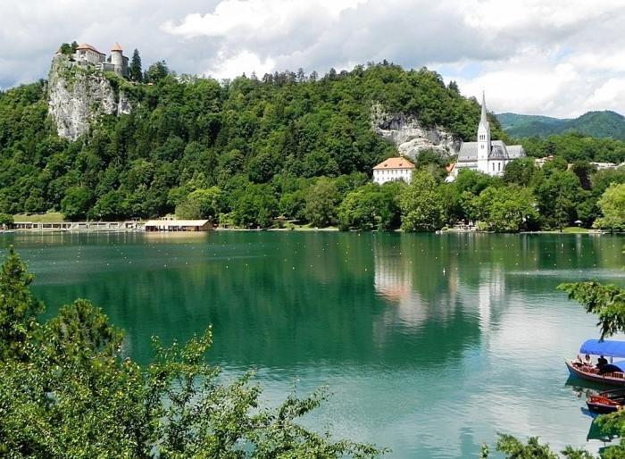 Первая остановка у нас в великолепном Бледе (Bled). В центре городка нашли большую стоянку, там и припарковались. В постсоциалистических странах я с неоплатой не экспериментирую, поэтому пришлось слегка пополнить местный бюджет. После этого мы рванули к озеру. Как же там красиво! Прежде всего, благодаря , расположенному на вершине утёса, взметнувшегося над Блейским озером.