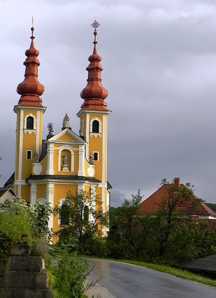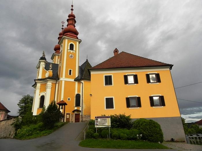 В этот тихий летний вечер трудно было поверить, что он является центром туристического паломничества. Тому виной местная церковь Девы Марии, которая считается ярчайшим памятником Словении в стиле барокко. Барокко нас удивить очень сложно. За последний год мы им пресытились. Но не могу не согласиться с тем, что в живописной сельской глуши этот храм, словно залитый солнцем, смотрится очень эффектно.