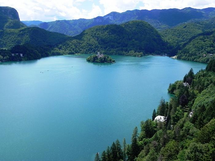 Виды, которые открываются с террасы, и впрямь запредельно чумовые. Безусловно, самый впечатляющий – это зеркало Блейского озера в окружении лесистых холмов.