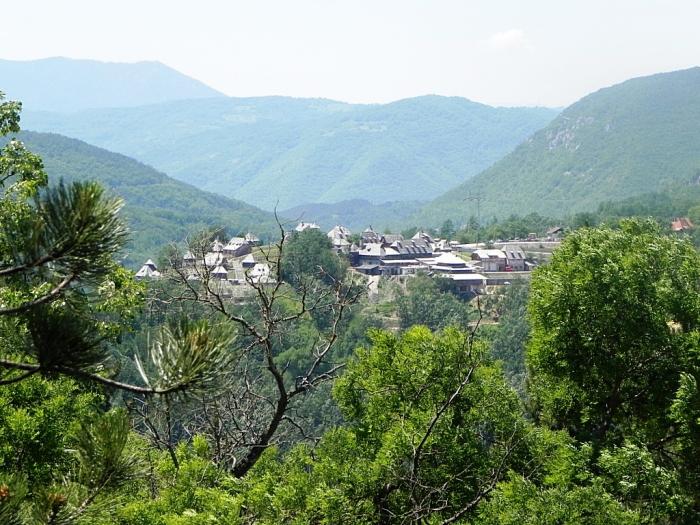Безусловная точка притяжения этих панорам — холм Мечавник, на вершине которого построена деревня Кустурицы Дрвенград.