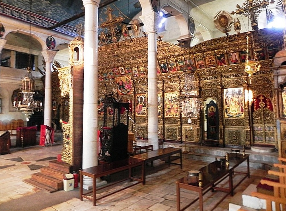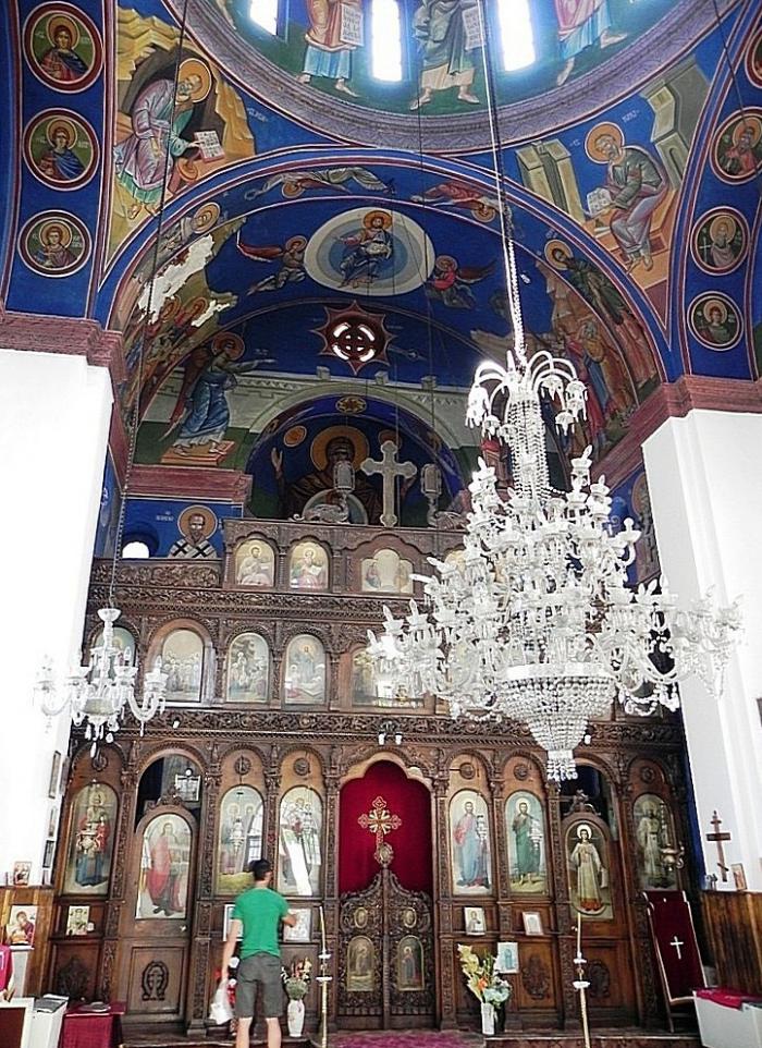 Время уже было сравнительно позднее, но церковь оказалась открытой. Воспользовавшись ситуацией, мы заскочили внутрь, чтобы оценить интерьеры и сделать пару скороспелых фото. Храм неожиданно удивил не только необычной конструкцией, но и богатством фресок, основательностью и грузностью светильников и грандиозностью безразмерного иконостаса.