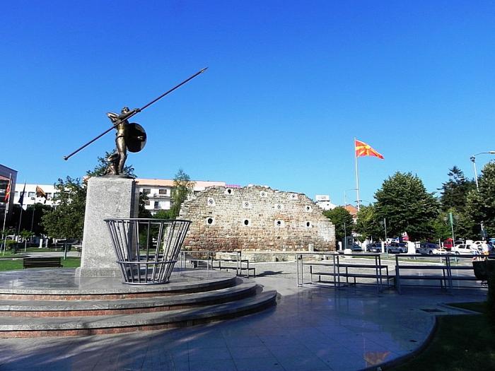 Вслед за фонтанами мы плавно переместились в условную «европейскую» часть исторического центра. Здесь, конечно же, главенствуют два главных «атрибута» современной македонской «национальной идеи»: гигантский флаг страны и неизменный памятник Александру Великому. А вот остатки крепостных сооружений османской эпохи весьма красноречиво намекают на разрушенный барьер, разделявший невнятную современность и величайшее прошлое.