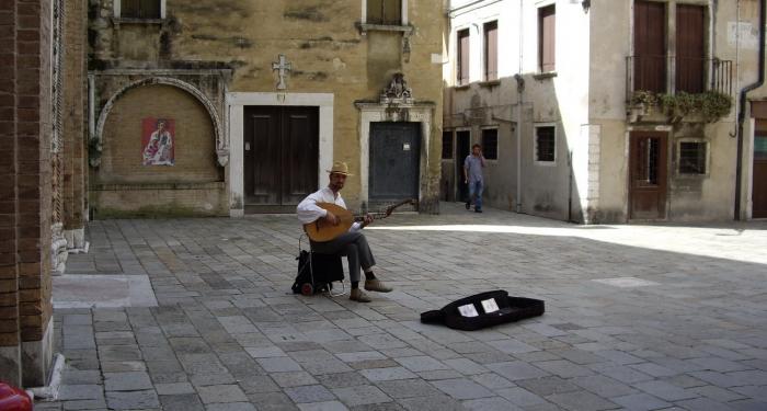 Как и в любом другом туристическом городе, в Венеции тоже есть желающие попаразитировать на туристах. На одной из маленьких площадей внутри квартала мы наткнулись на колоритного персонажа с итальянской балалайкой, вероятно, с лютней. Он не играл, а просто сидел, держась за инструмент. Интересно, на что он здесь рассчитывал?