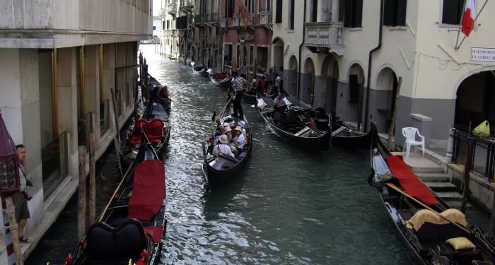 В городе совершенно нет машин, все ходят пешком. А туристов еще потчуют местной экзотикой: катанием на гондолах. Этих гондол очень много, они везде, и мне показалось, что их больше, чем требуется. Основная масса гондол стоит на приколе, а рядом с ними стоят скучающие голодные гондольеры в специфических одеяниях, которые с надеждой ловят взгляды прохожих. Катающихся туристов очень мало.