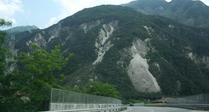 Альпы в Италии не такие как в Австрии, более скалистые. Мы ехали по ущелью вдоль горной речки. Платная дорога шла параллельно нашей, но на более высоком уровне, она построена на высоких железобетонных опорах, от горы к горе, от тоннеля к тоннелю.