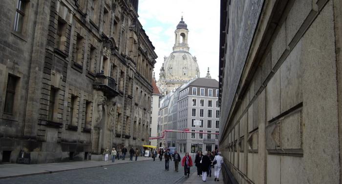 Проходя мимо настенного керамического панно «Шествие князей» (на здании справа), на которое мы почти не обратили внимание, так как заранее ничего о нем не знали, мы увидели чудесную перспективу на церковь Богородицы (Frauenkirche), которая была заново построена в 2005 году. Рука сама потянулась к фотоаппарату. Кстати, розовая труба, которая пересекает улицу чисто декоративная, это не трубопровод. Мы не поняли, с какой целью она там закреплена.