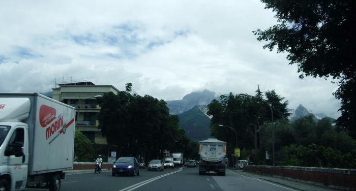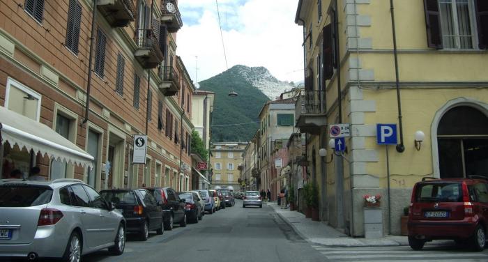 Город Каррара разместился у подножия гор. Его неширокие улицы плотно заставлены припаркованными автомобилями, остается только проезд. Где-то остановиться – большая проблема.