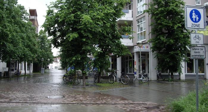 Перед нами предстал хорошенький, чистенький немецкий городок. Я обратил внимание, что нигде не видно земли. Или асфальт, или брусчатка, или плитка, или газон. Поэтому и грязи нет, несмотря на дождь. Из-за плохой погоды людей на улице практически не было.