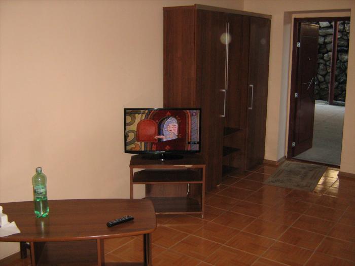 У официантки спросил, что есть на первое. Она ответила, что только бульон. Ну что ж, тогда нужно брать второе. Поэтому к трём бульонам две порции свиного шашлыка и хинкали, а так же минералка и чай. Когда принесли бульон, мы были немного обескуражены. Три большие миски с говяжим бульоном, в котором плавают куски мяса грамм по триста. Потом в счёте прочитал, что бульоном официантка называла суп татариахни (суп из говяжего бульона, лука, моркови и зелени). Отказываться от второго было поздно, поэтому хинкали с трудом съели, т.к. их трудно перевозить, а шашлык попросили запаковать с собой. Он нам пригодился, когда стояли в очереди на границе. Счёт вместе с чаевыми получился 43 лари.