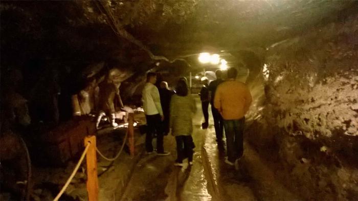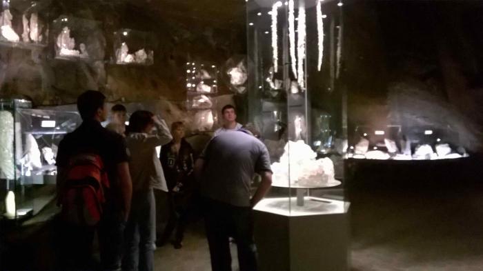 Экскурсия начинается спуском на 64 м по четырем сотням ступенек, потом переходы по туннелям с осмотром разных экспозиций, — музеи, огромные залы, озера, взрывы породы, музыка Шопена. И всюду соль.