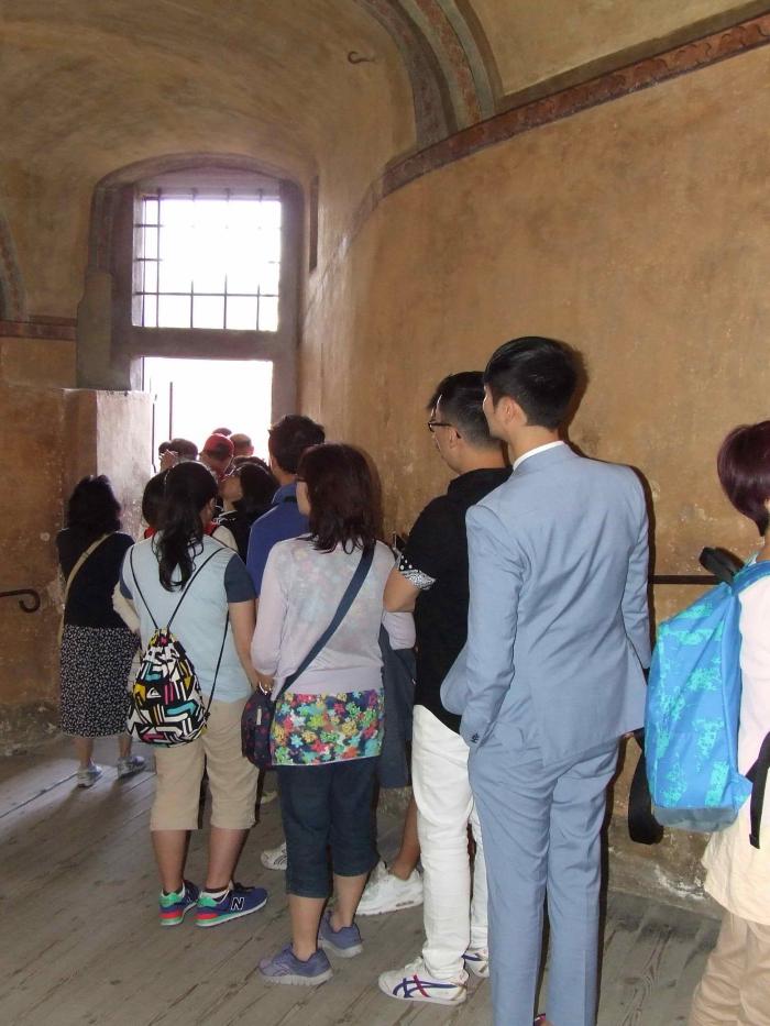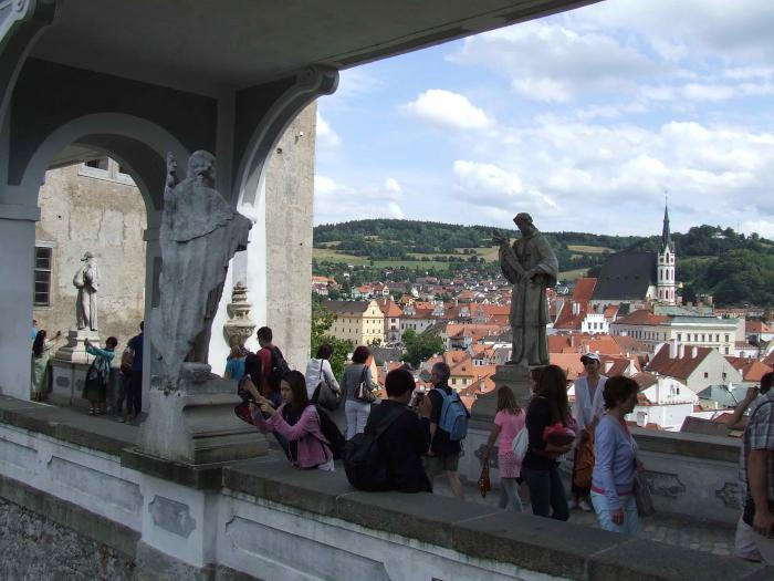 Толпы туристов, которых сюда привозят на 2-3 часовые экскурсии из Праги, стараются все по максимуму нафоткать, накупить сувениров — и бегом к своим автобусам. А вот, к примеру, очередь дисциплинированных китайцев — запечатлеть себя на дворцовом балкончике на фоне панорамы города. Чуть дальше будет целая открытая панорамная галерея — снимайся хоть всей толпой, — но они нашли это…