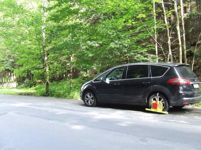Дима припарковался почти на въезде в городок, боялся, что больше не найдет парковки, поэтому пришлось мне стартовать из самой дальней точки, от реки. (К слову, дальше по маршруту было несколько парковок, действительно заполненных под завязку, а машины, припаркованные в неположенных местах на обочинах выглядели в полицейских колодках вот так: