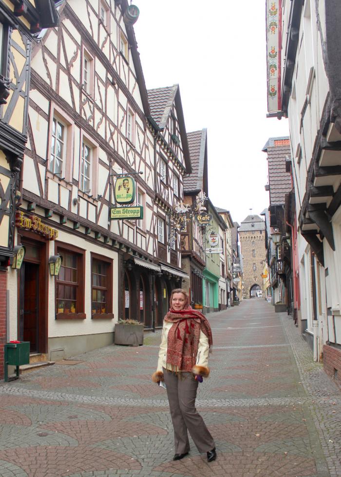 Первый город, встречающий нас — Кёнигсвинтер. Милый городок с парой пешеходных улиц и фахтверковыми домиками на них, над городом возвышается гора Драхенфельс с руинами резиденции архиепископа. Вид на Рейн отсюда, описан Байроном в поэме «Паломничество Чайлд-Гарольда». Я не читала, но галочку себе поставила — Байрону понравилось и я посмотрю. Эти места связаны с легендами о Нибелунгах, чему в подтверждение немцы поставили здесь странное и конечно закрытое в зимнее время сооружение — «Зал Нибелунгов». В связи с моей неграмотностью, моя сама яркая ассоциация с Нибелунгами — это эпизод из «Блефа», поэтому оставим это для посещения с экскурсоводом.