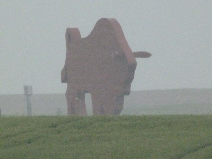 Всего мы провели рядом с Коссовским замком около часа. В 18:50 возвращаемся на трассу. Продолжаем свой путь на восток. Легендарного зубра — излюбленный объект фото-сафари для проносящихся транзитом через Беларусь путешественников — видим с параллельной трассы, куда нас почему-то увел навигатор. Зато он получился какой-то более натуральный, пасущийся, так сказать, в прериях…