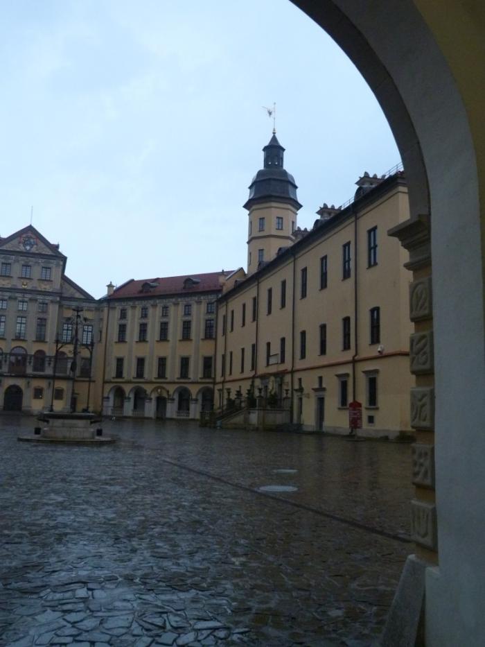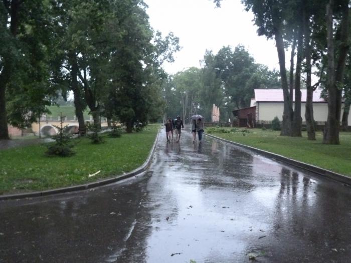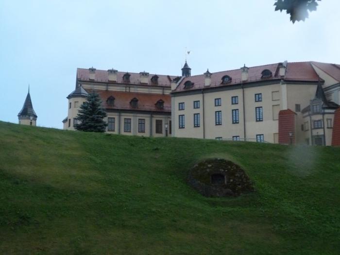 В 20:35, в 120 км от съезда в Коссово, мы поворачиваем к еще более знаменитому в современном туристическом бизнесе Несвижскому замку. Чуток покрутившись вокруг внушительных размеров парка, мы припарковались, чуть не доезжая платной стоянки, где остановились обогнавшие нас родственники. Они уже успели прогуляться под проливным дождем и всеми силами души стремились в комфортную сухость своей машины.