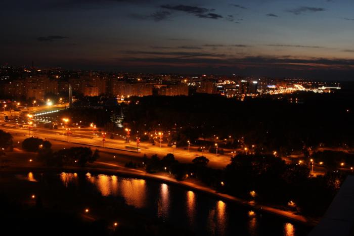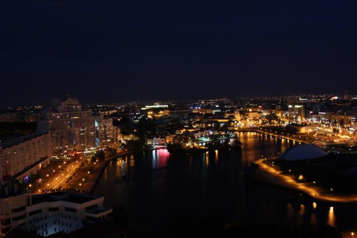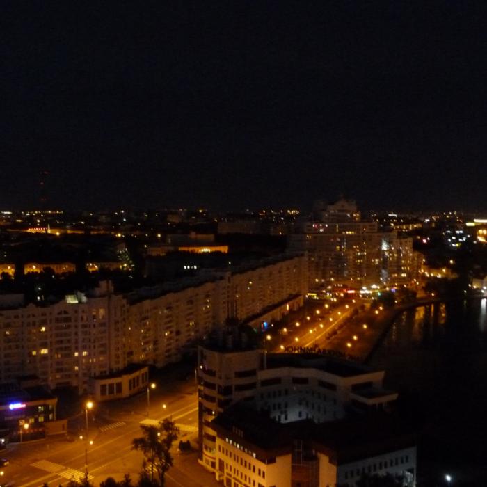 Ну и мы были бы не мы, если бы не попытались залезть куда-нибудь повыше, чтобы посмотреть на Минск свысока. :) В столице Беларуси это обычно делают с одной из двух точек. Можно забраться на новую Библиотеку. Выглядит она очень футуристично, видно с нее далеко. Но фотографии оттуда меня совсем не впечатлили, да еще и вход платный. А тут совсем неподалеку нашлась гостиница Беларусь, у которой на крыше, на высоте 73 метров над землей, тоже смотровая. Правда, когда мы пришли, нас стали убеждать, что уже поздно, темно, подсветку сейчас выключат и т.д. Но всё равно позвали начальника охраны, и он нас поднял на лифте погулять. Вход, вроде бы, тоже должен быть платным, но хоть убей не помню, чтобы мы что-то платили. :)
