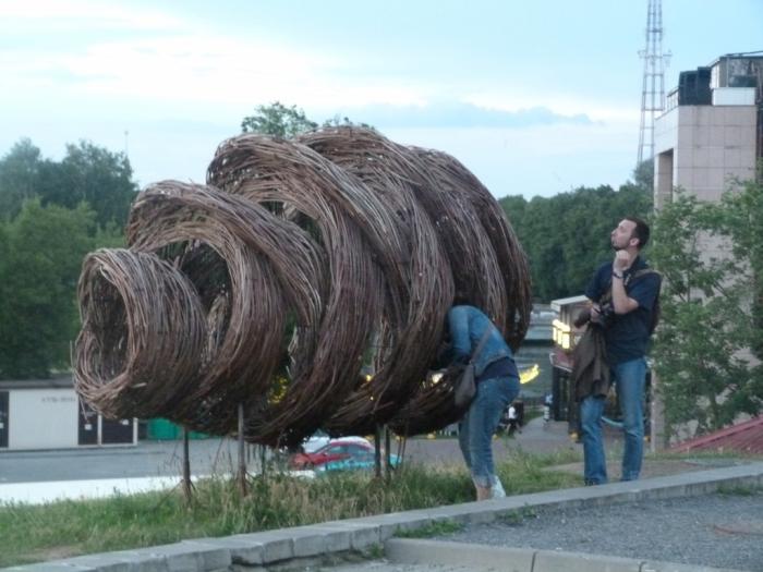 Мимо причудливых памятников непонятно чему движемся к набережной реки Свислочь.