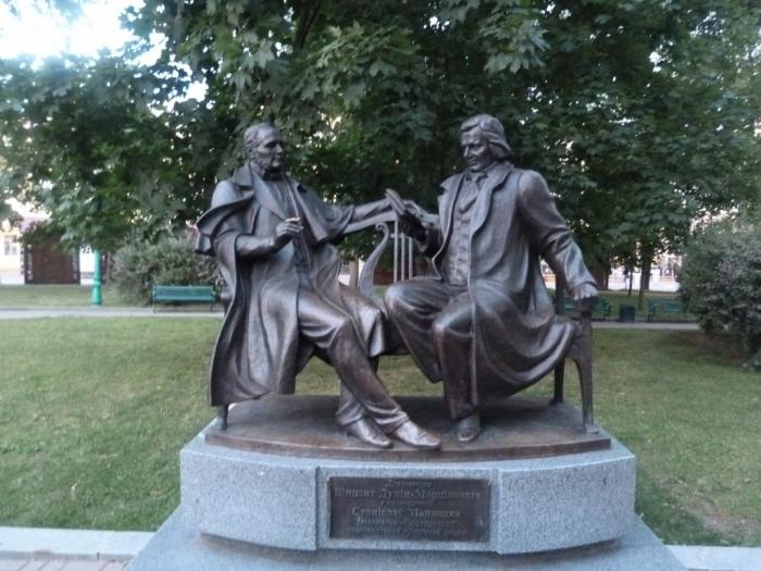 Вообще, тут очень много памятников, связанных с искусством. Где-то здесь есть скамейка, которая начинает играть музыкальные произведения Шостаковича, когда на нее садишься. А это памятник создателям белорусской оперы: