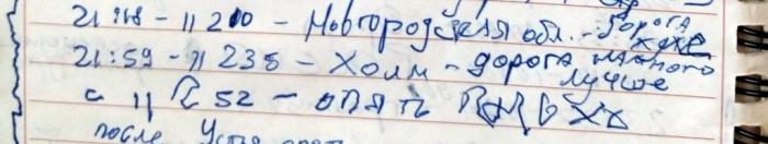 В наших путешествиях мы ведем бортовой журнал с записями о километраже, маршруте и встречающихся на пути приключениях. Это работа штурмана, в роли которого после ухода моей Ани «в отпуск по уходу за ребенком» выступает, обычно, Лия. В данном случае, показательна не сама запись, а резкое изменение почерка штурмана. Тоже хорошая иллюстрация к качеству дороги: