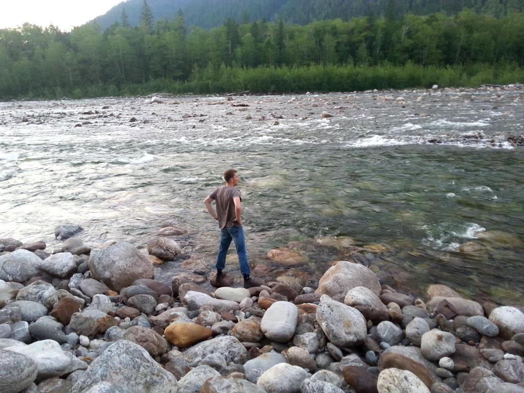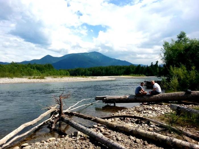 Прошли мостик, свернули на развилке опять налево. Прошел ещё час. Солнце спускалось всё ближе к еле заметным через верхушки деревьев горам. В наши сердца начало закрадываться сомнение. Остановились, прислушались к шуму реки, посмотрели карту, сверились с GPS. Всё правильно. Идем дальше. Прошел ещё час. Всё те же упавшие деревья и папоротники. Хорошо, что мошкары нет. Уже несколько раз подумали, что зря задумали всё это. Но врагу не сдается наш гордый Варяг! Только вперед! Идем… Вот через пол часа заметили усиливающийся шум реки. И на самом деле через несколько минут тропинка привела нас на берег р. Снежная, недалеко от которого было устье реки Селенгинка. Вид потрясающий! Огромные круглые камни, по которым с бешенной скоростью несется вода. Всё это окружает густой лес, а за ним виднеются мощные махровые горы. Такое мы видели только на картинках.