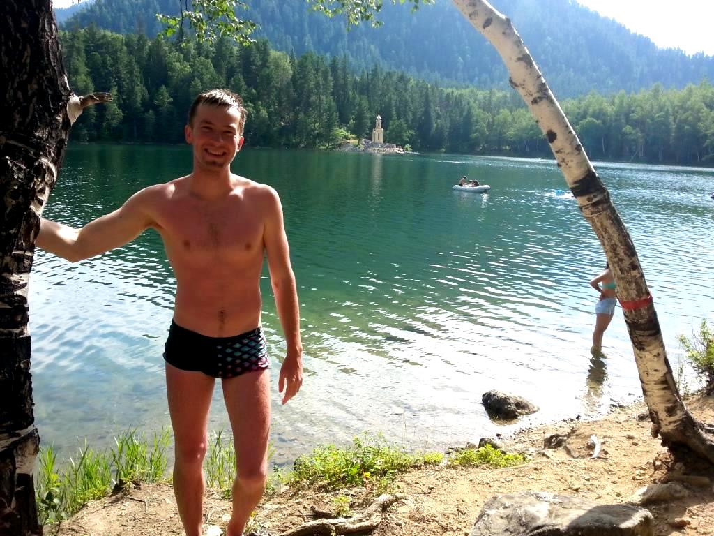 Для прохода на Изумрудное озеро нужно было заплатить 50 руб. с человека и 500 руб. за авто. Мафия! Мы оставили машину у шлагбаума, а сами нашли тропинку среди папоротника высотой по грудь и по ней вышли на территорию турбазы. Озеро оказалось небольшим, но очень красивым. Небольшой ухоженный пляж с большим количеством людей. Здесь купается много местных, так как в Байкале вода холодная. Названо озеро Изумрудным неспроста, вода на самом деле отливает таким цветом. Правда, не такая теплая, как мы ожидали. В озерах вблизи Казани вода теплее в это время года. На другом берегу раскинулись высокие махровые темно-зеленые горы треугольной формы. Там народа нет, только изящная часовенка, от которой изредка доносится звук колокола. Бьют в него приплывшие туда на катамаране отдыхающие.