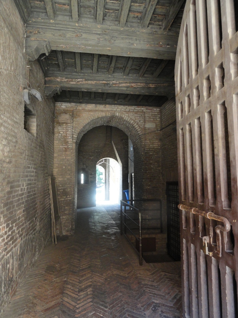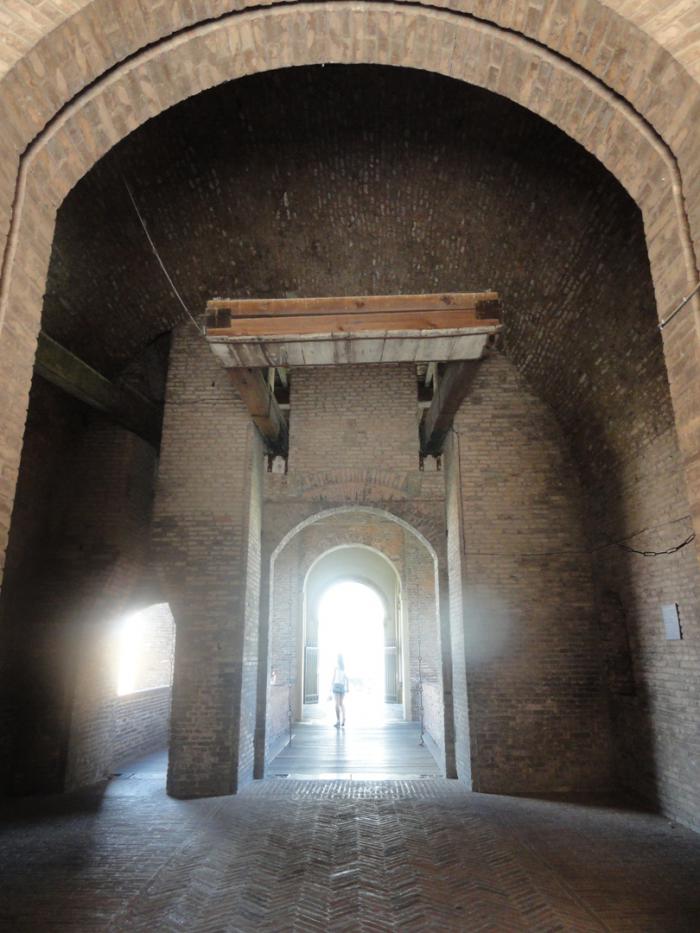 Узкий коридор ведет от моста во внутренний двор.